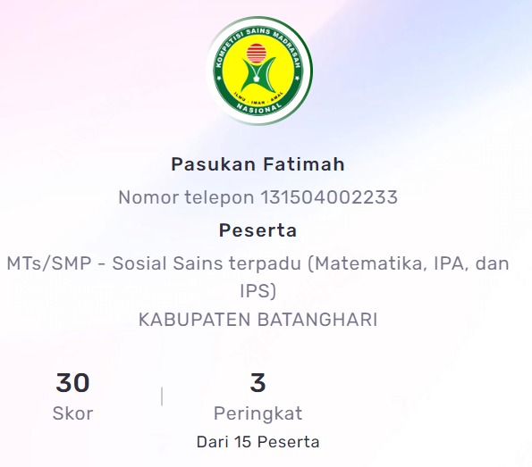 Hasil diumumkan via Akun KSM madrasah masing-masing. KSM tahun 2024 ini ada 6 peserta utusan dari MTsN 3 Batang Hari, dan 3 diantaranya belum berkesempatan mendapat juara. Adapun 3 peserta beregu yang berhasil meraih juara 3 yaitu Isti Haroh, Diah Endriani, dan Puti Khairussiva.