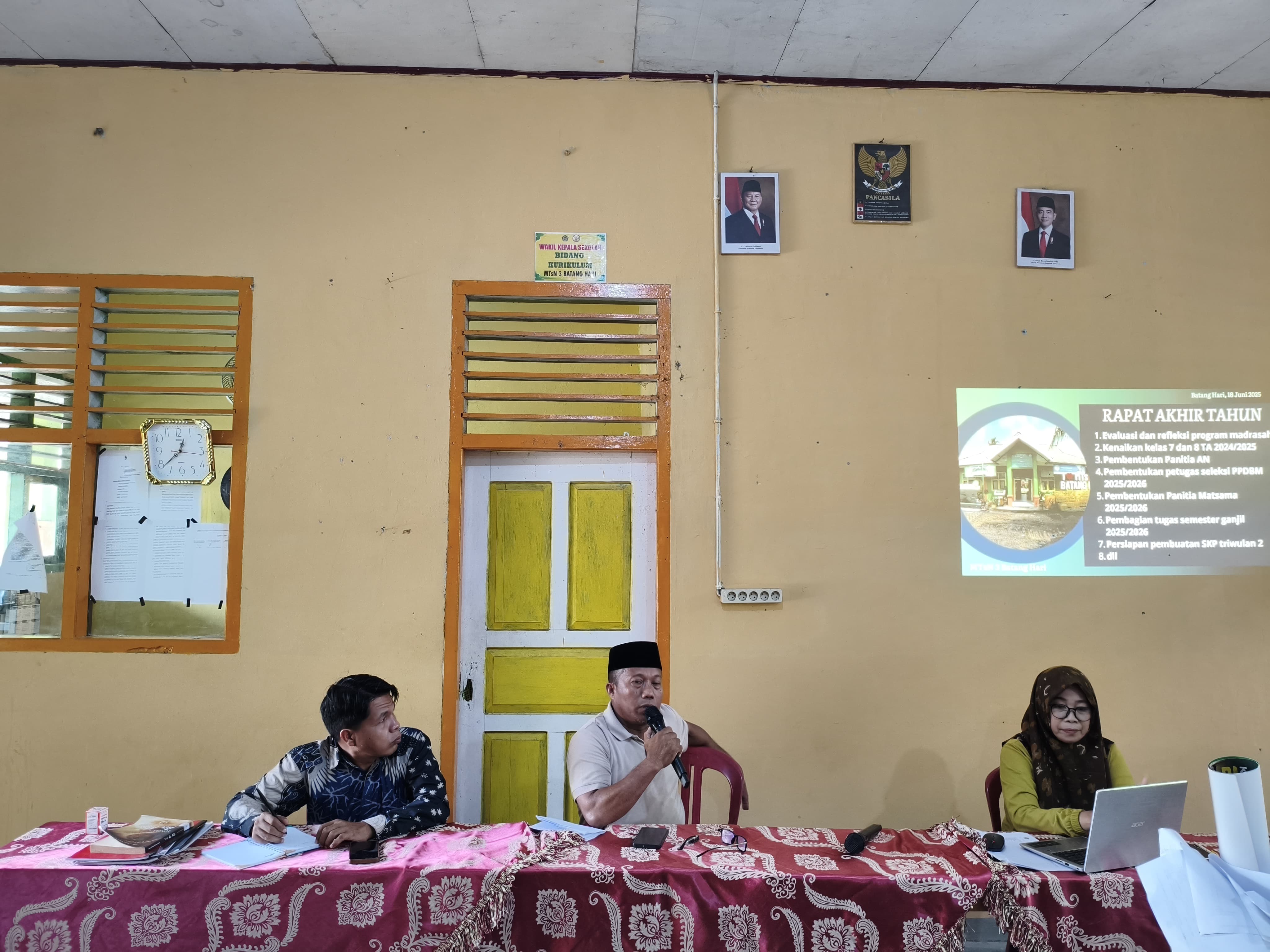 Batang Hari (MTsN 3) – MTs Negeri 3 Batang Hari menggelar agenda rutin rapat bulanan. Rapat rutin yang dilaksanakan setiap bulannya dipimpin langsung oleh Kepala MTsN 3 Batang Hari, Muhammad Zaki, S.Pd. didimpingi oleh Wakakur, Wikarti, S.Pd. dan Kaur TU, Endar Muda Harahap, S.Pd.I. sebagai notulen serta diikuti oleh tenaga pendidik dan kependidikan di ruang guru. Rabu, (18/6/2025).