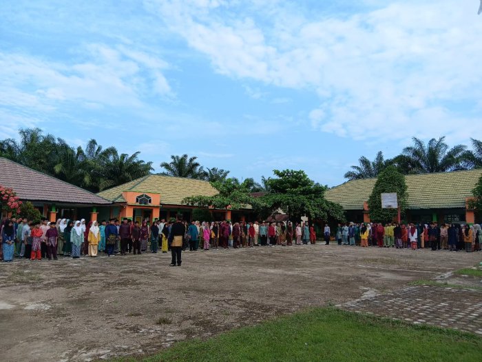 Para guru dan pegawai pria tampil mengenakan teluk belango lengkap dengan kain sarung dan peci hitam, sementara peserta wanita tampak anggun memakai baju kurung dan tengkuluk. Selaras dengan itu, para siswa pun ikut mengenakan busana tradisional Melayu Jambi sehingga suasana upacara tampak serasi dan sarat nilai budaya.