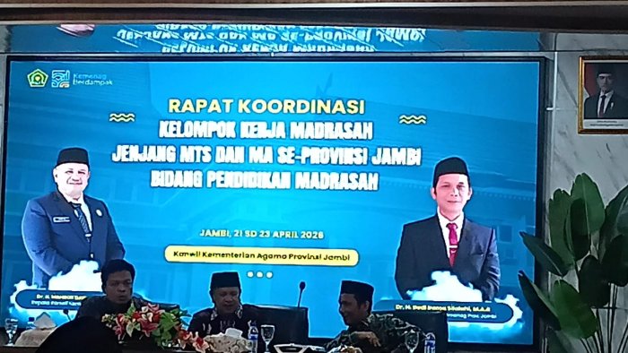 Batang Hari (MTsN 3) - (Plt) Kepala MTsN 3 Batang Hari, Muhammad Zaki, S.Pd.I, mengikuti kegiatan Rapat Koordinasi (Rakor) yang diselenggarakan oleh Kantor Wilayah Kementerian Agama Provinsi Jambi. Kegiatan ini berlangsung selama tiga hari, mulai Selasa hingga Kamis, 21–23 April 2026, bertempat di Aula Kanwil Kemenag Jambi.